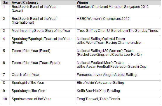 Official Results Of The Singapore Sports Awards 2013